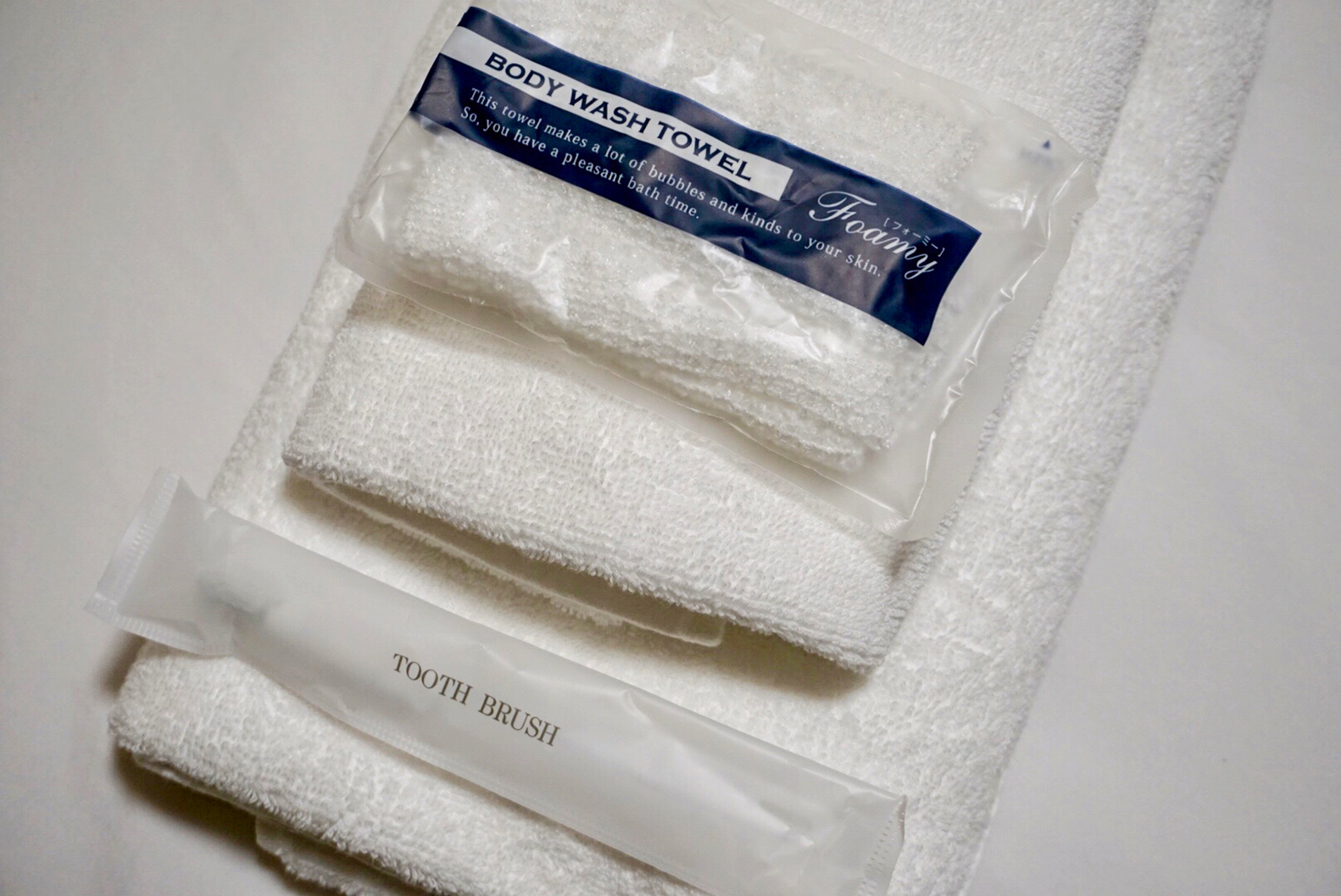 バスタオル、フェイスタオル、ボディウォッシュタオル、歯ブラシ、歯磨き粉をご用意しております。